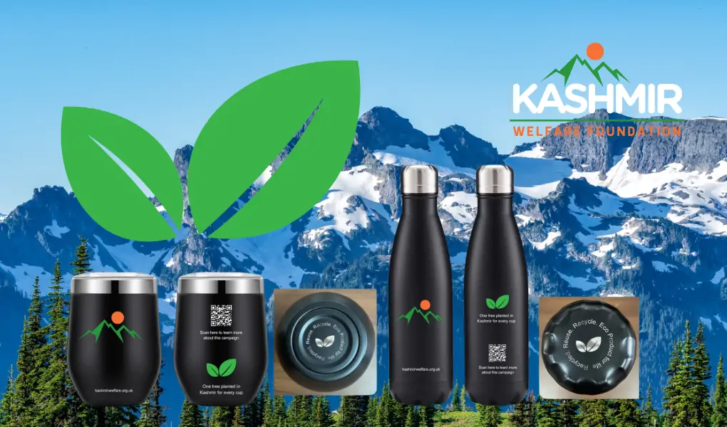 For every eco bottle or cup purchased, the Kashmir Welfare Foundation plants a tree in Azad Kashmir through its Green Kashmir Campaign.